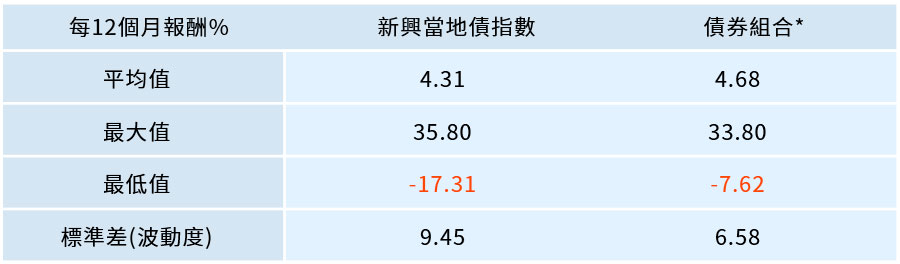 將近10年的績效試算結果顯示,新興當地債市表現承壓時,債券組合會展現抗跌效果,例如:2015年中新興當地債市指數跌深17.31%時,債券組合跌幅僅7.62%;而在新興當地債市漲升區間,債券組合也積極跟進上漲,甚至長期績效平均並不遜色於單一特性債券,可見債券組合具有更追漲抗跌的特性。